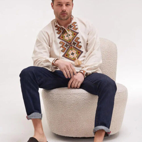 Men’s Cotton Shirt Traditional Ukrainian Vyshyvanka Embroidery Svyatoslav beige