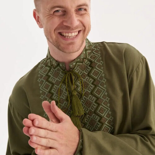 Men’s Olive Khaki Linen Shirt Traditional Ukrainian Vyshyvanka Embroidery