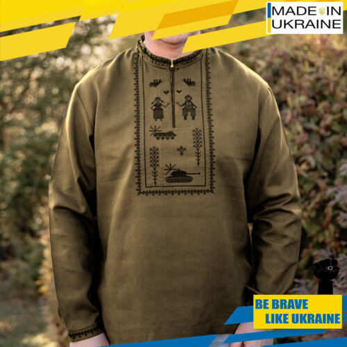 Men’s Khaki Linen Shirt ZELENSKYY Ukrainian Vyshyvanka Embroidery