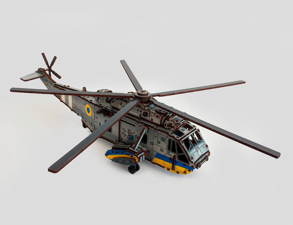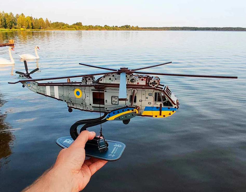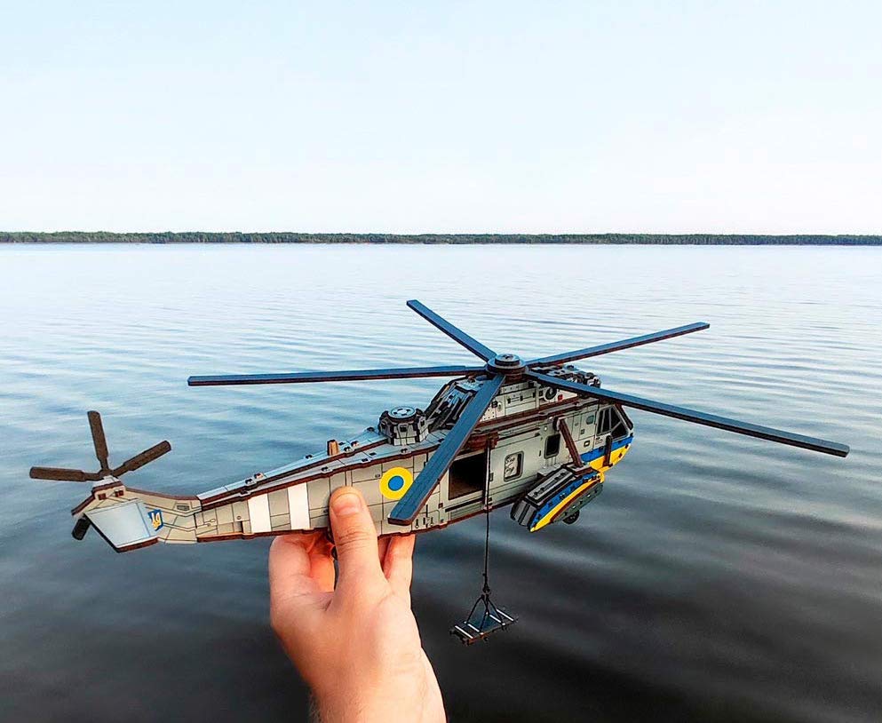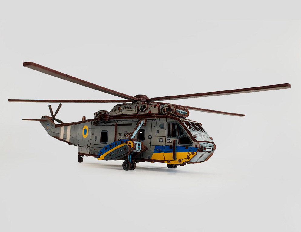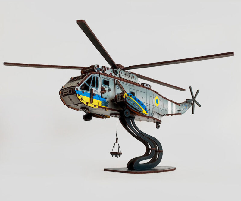 The Sea King Army Helicopter is a wooden 3D model, outwardly similar to the Sea King helicopter, which the United Kingdom transferred to Ukraine in 2023. Made in a scale of 1:48 in the colors of a real army helicopter. Assembled independently according to the instructions without the use of glue.