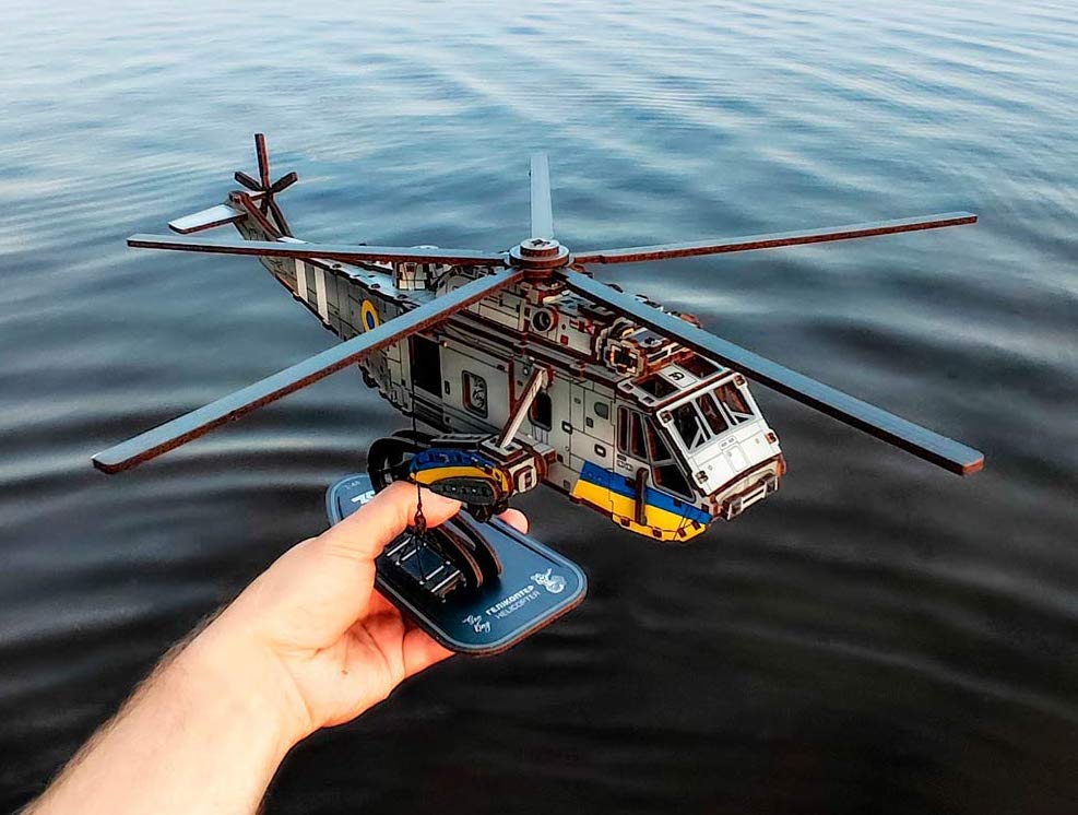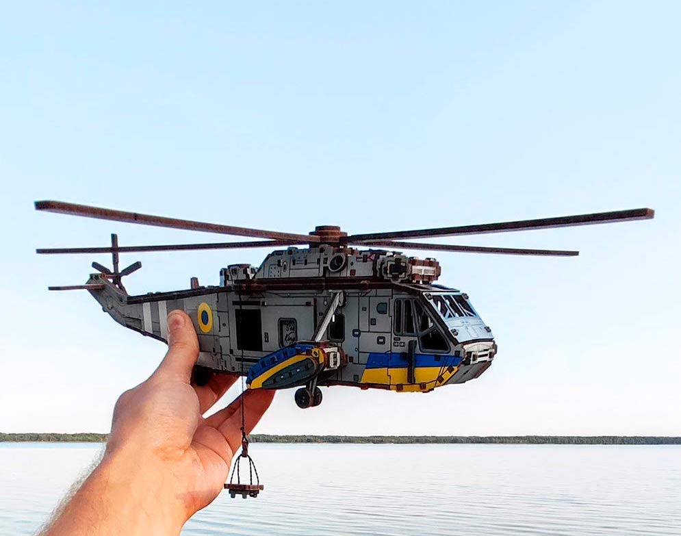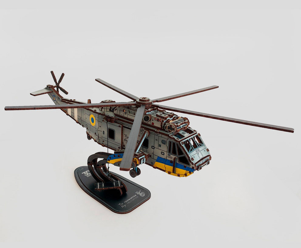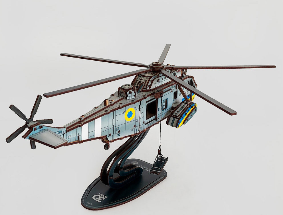 The Sea King Army Helicopter is a wooden 3D model, outwardly similar to the Sea King helicopter, which the United Kingdom transferred to Ukraine in 2023. Made in a scale of 1:48 in the colors of a real army helicopter. Assembled independently according to the instructions without the use of glue.