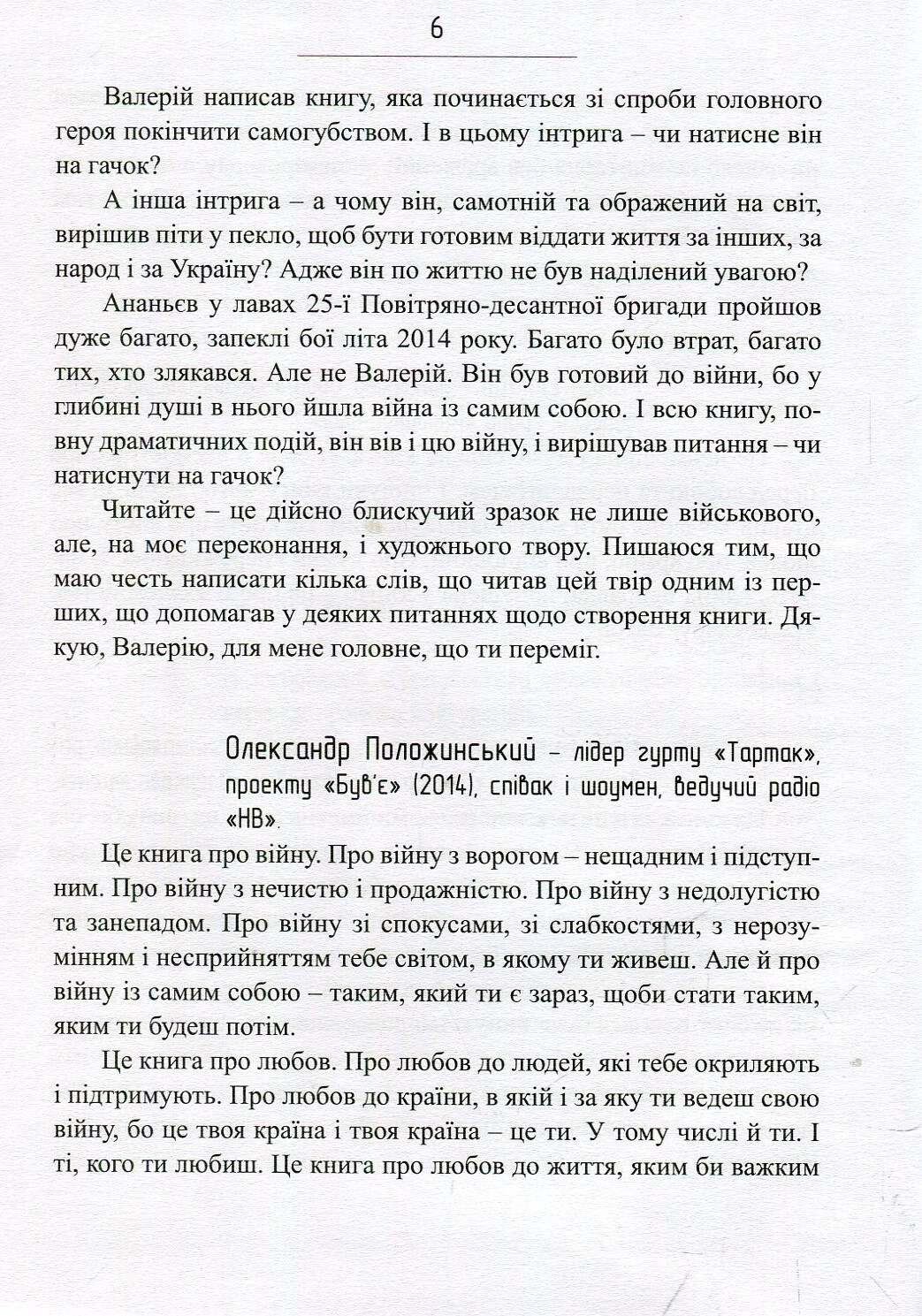 “Footprints on the Road” by Valery Ananiev is not just a book that tells about events that take place several hundred kilometers from us. This book conveys the whole atmosphere of the horror of war, the difficult trials that have to be overcome every day by security forces and ordinary people who are currently in the East. A young guy, a little skeptical and contemptuous of the authorities, and a little frivolous, goes to the front, and after returning, he wants to share his experience with the rest of the Ukrainians. Yes, reviews of Valery Ananiev’s book “Footprints on the Road” are permeated with empathy and an attempt to understand how to be where it is most difficult.