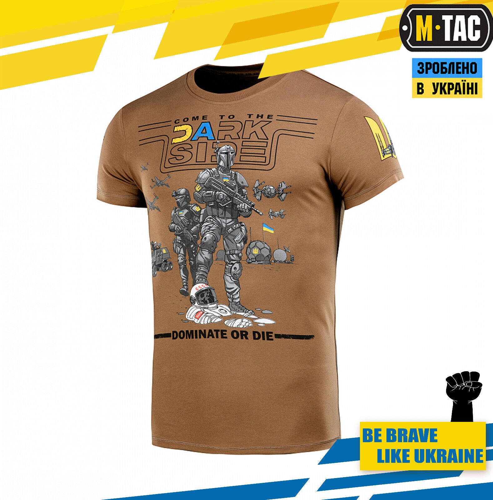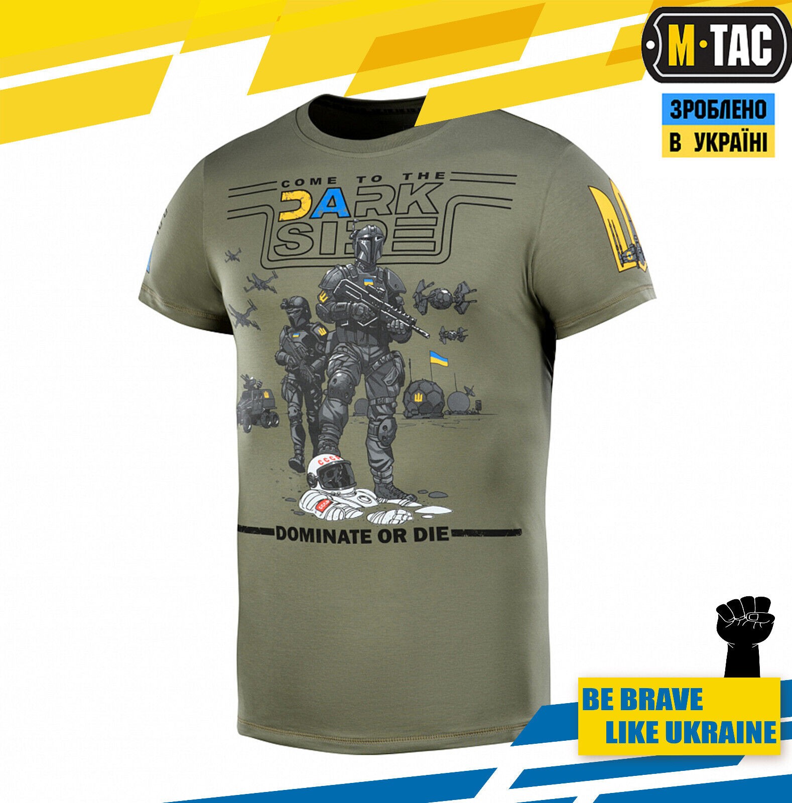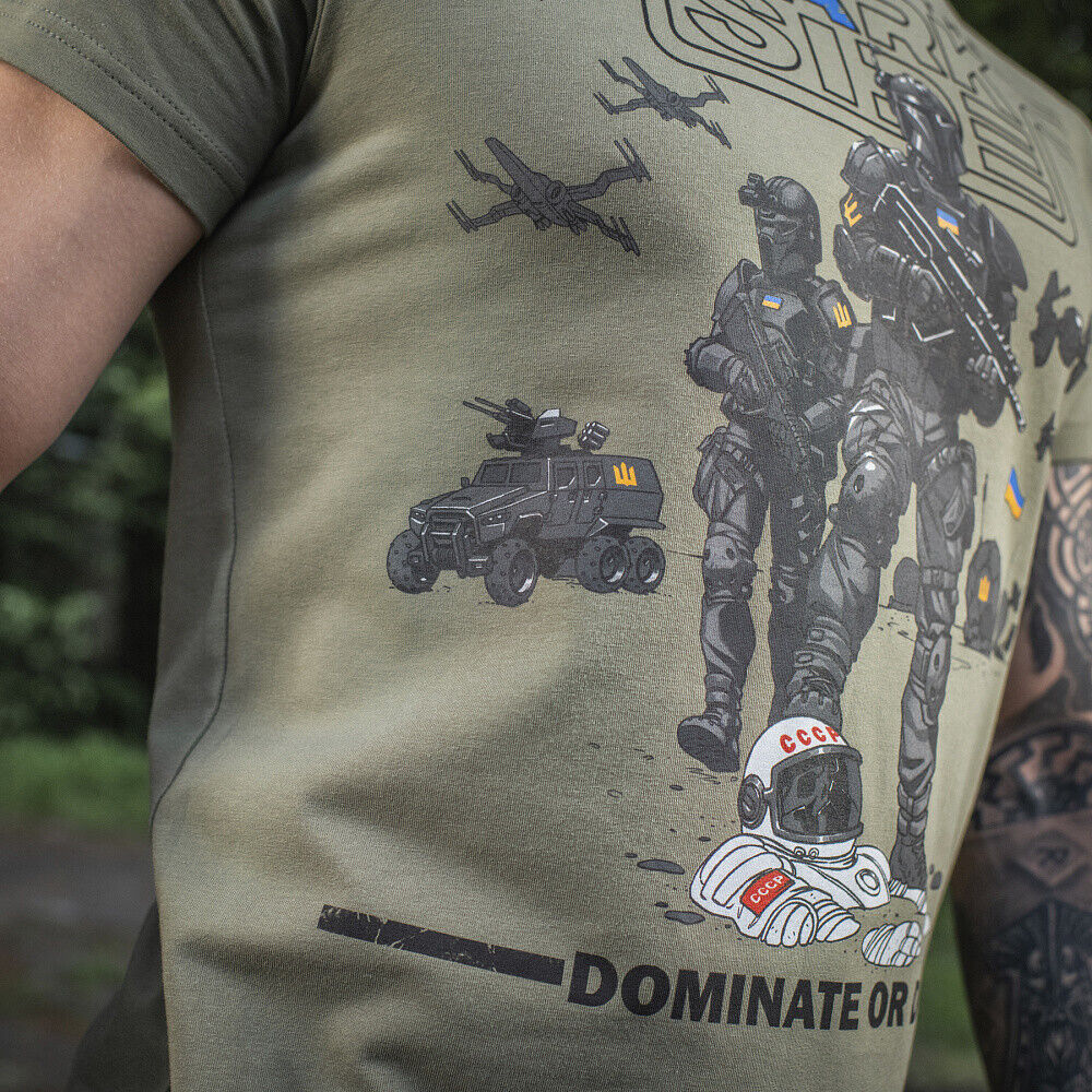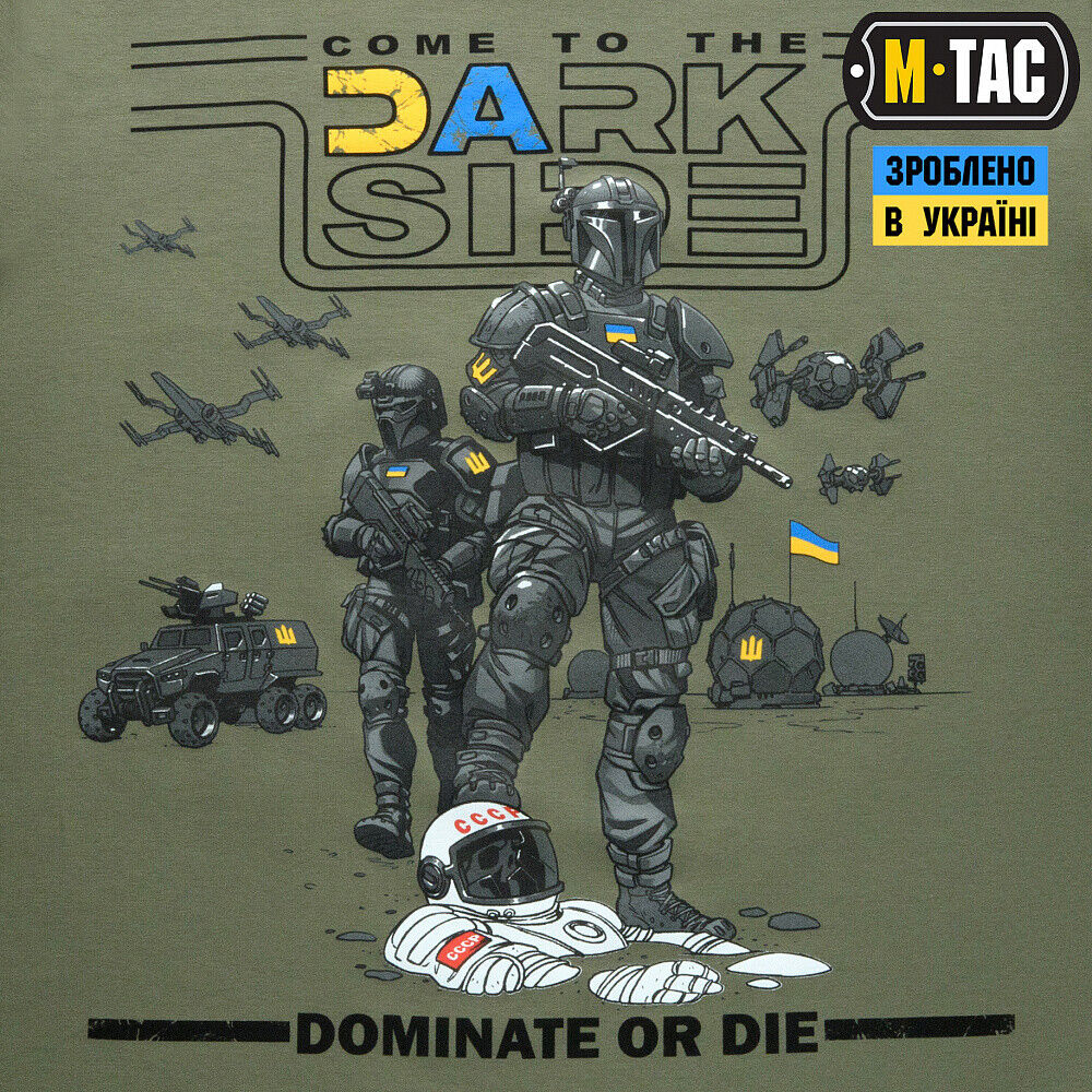 In the main part of the print on the chest is written “Go to the Dark Side” and below “Dominate Or Die” with an original image of Ukrainian cosmonauts with weapons standing on the corpses of Soviet enemies.