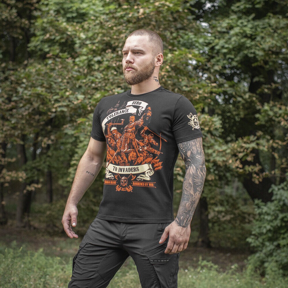 The M-Tac ZERO TOLERANCE TO INVADERS t-shirt is made from a blend of cotton (93%) and elastane (7%). Thanks to this, the t-shirt can withstand many washes without losing its shape. “Zero tolerance to invaders” is the main idea behind this bold and stylish print. The print is dedicated to the historical events of the year 1036 when Kyivan Prince Yaroslav the Wise delivered a decisive blow to the Pechenegs, who had been raiding Kyivan Rus for a long time. Centuries may pass, but the traditions of our ancestors continue to endure on our land.