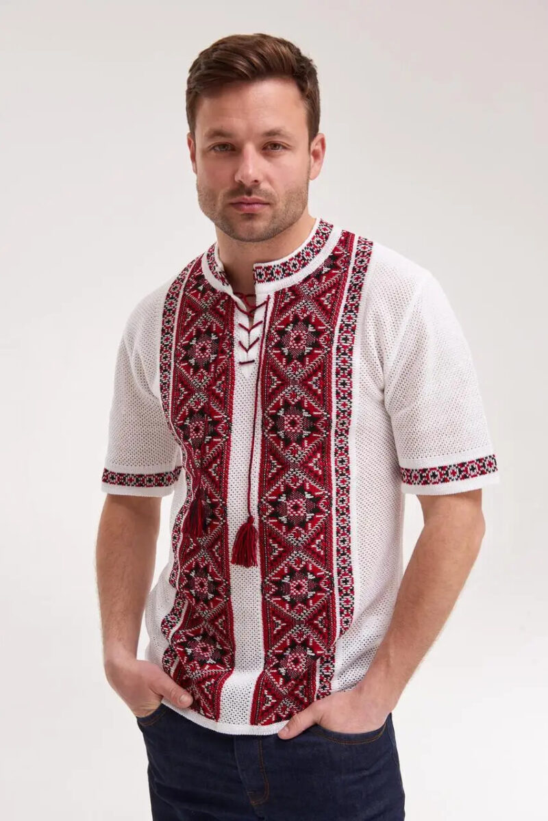 This men’s shirt (sorochka or vyshyvanka) is made of cotton.  Fabric of white color. For an ornament embroidery threads here were used.