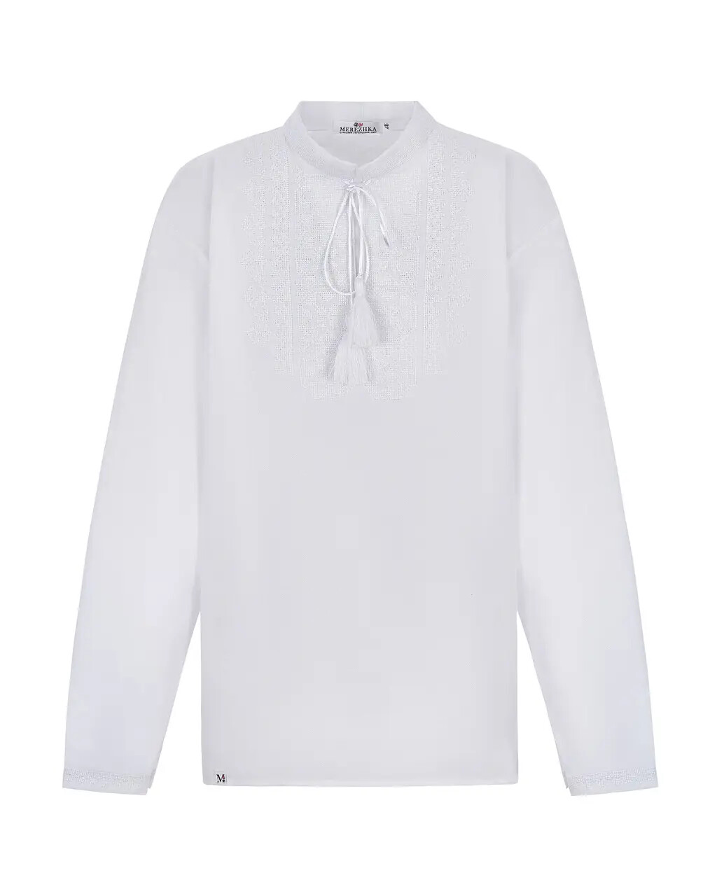 This trendy embroidered shirt is designed in the “classic” style, which is highly favored by young people nowadays. The fabric used is pure linen and comes in white color.