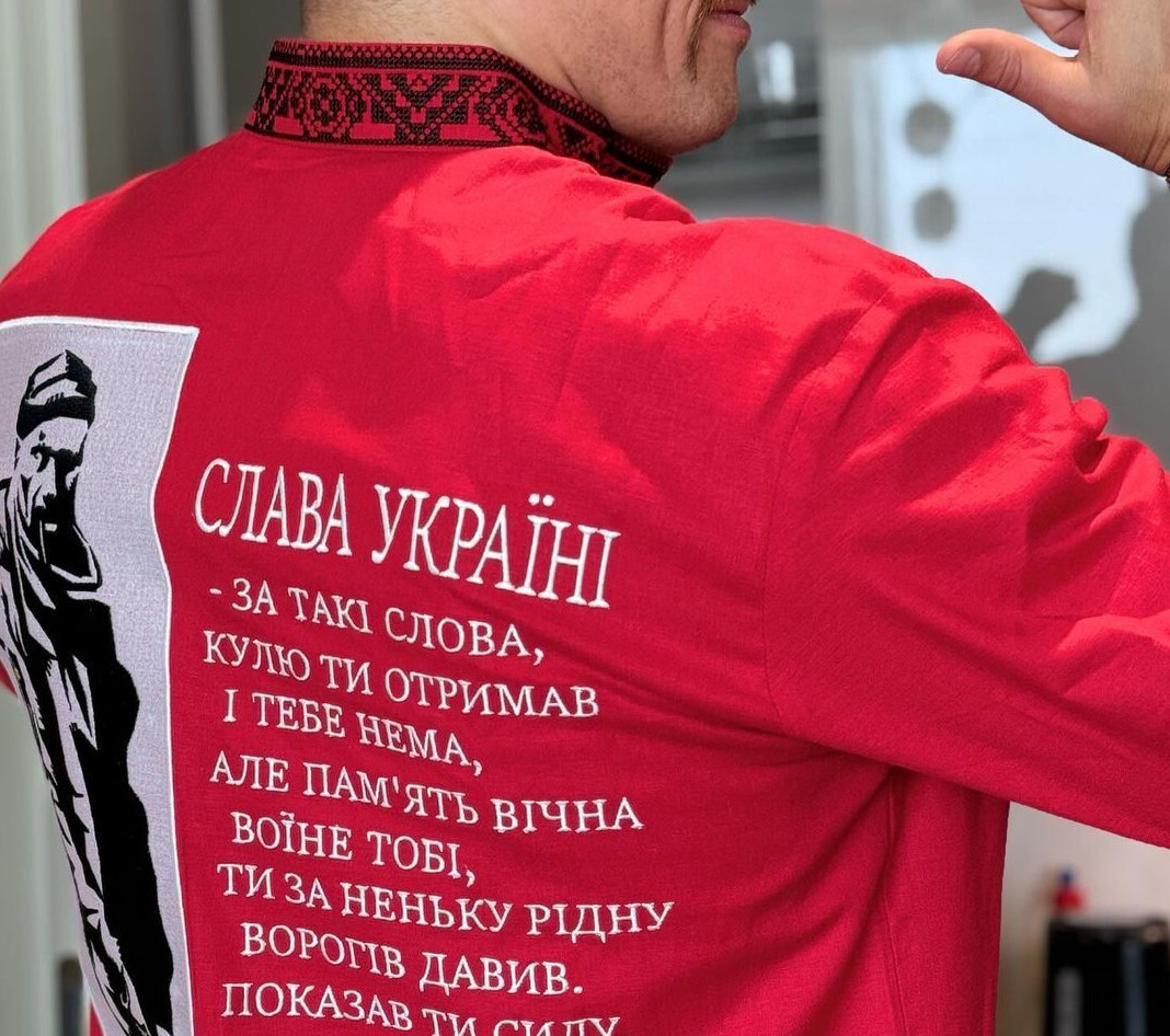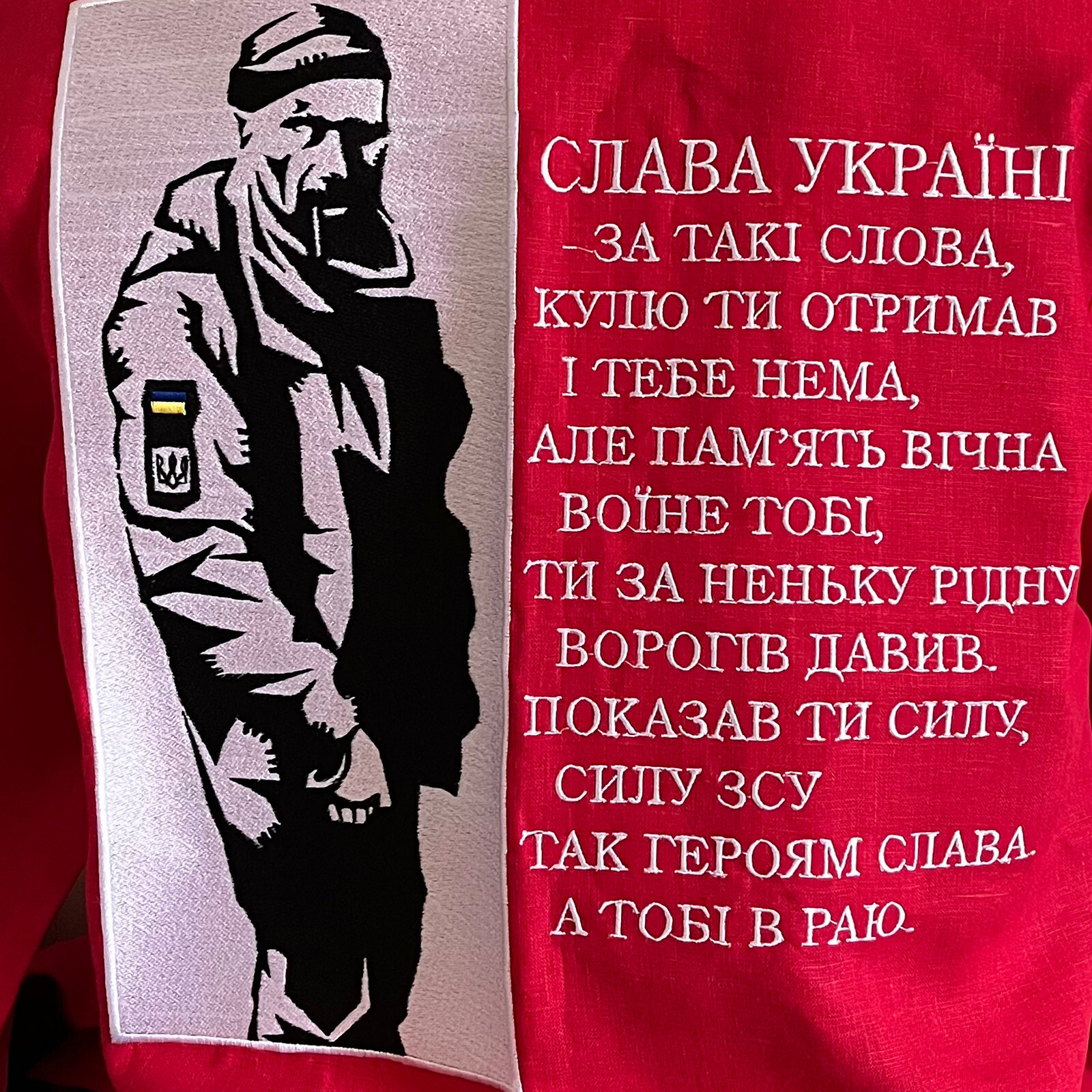 “Glory to Ukraine — for such words, you received a bullet, and you are no more, but eternal memory to you, warrior, you defended your motherland, you defeated the enemies. You showed strength, the strength of the Armed Forces of Ukraine, so glory to heroes, and you are in paradise,” is written on the vyshyvanka.