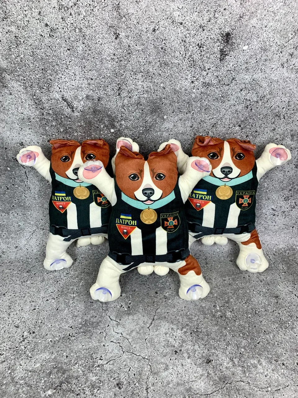 Patron dog car toy with Ukrainian patriotic inscriptions, on suction cups