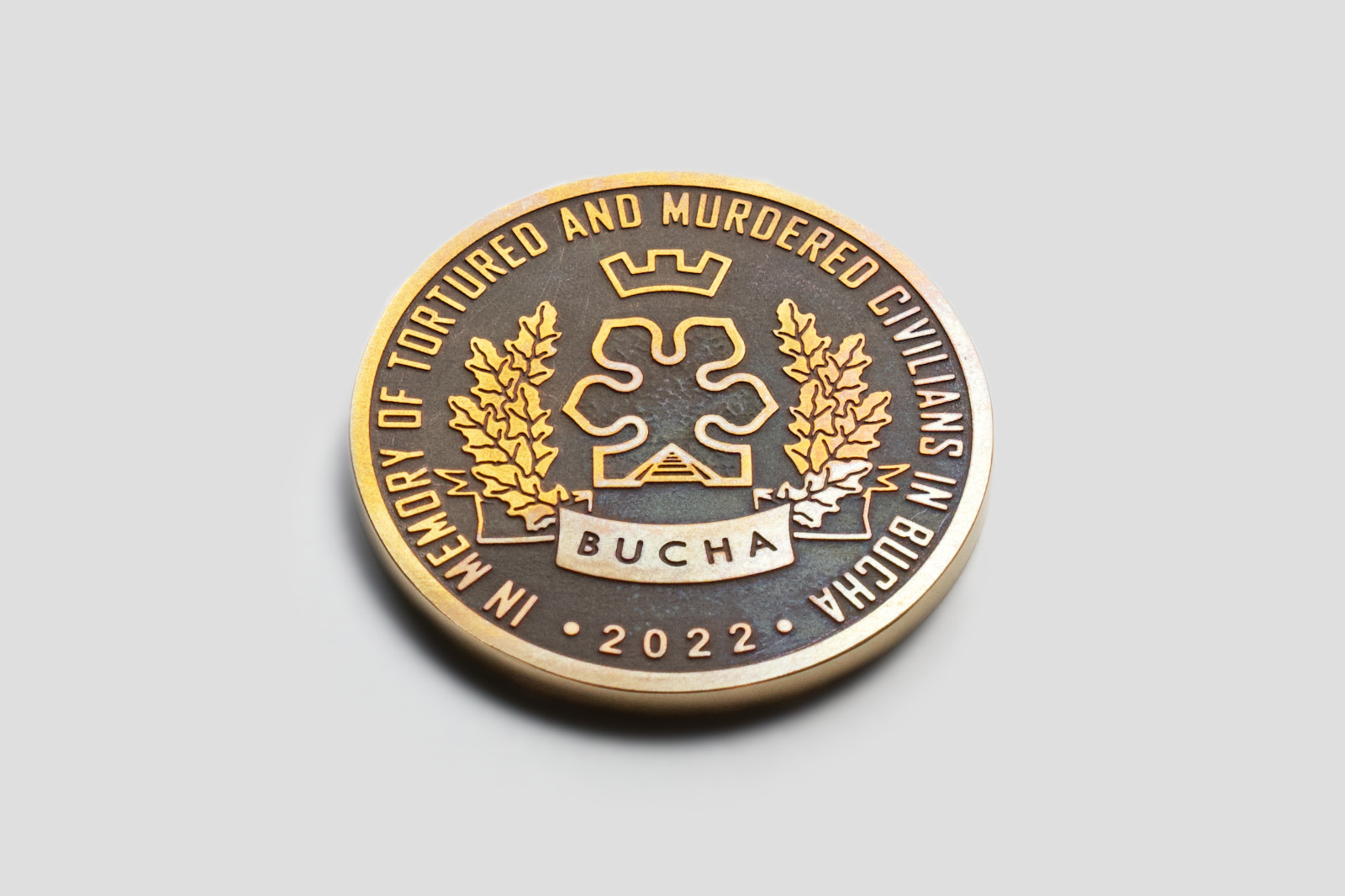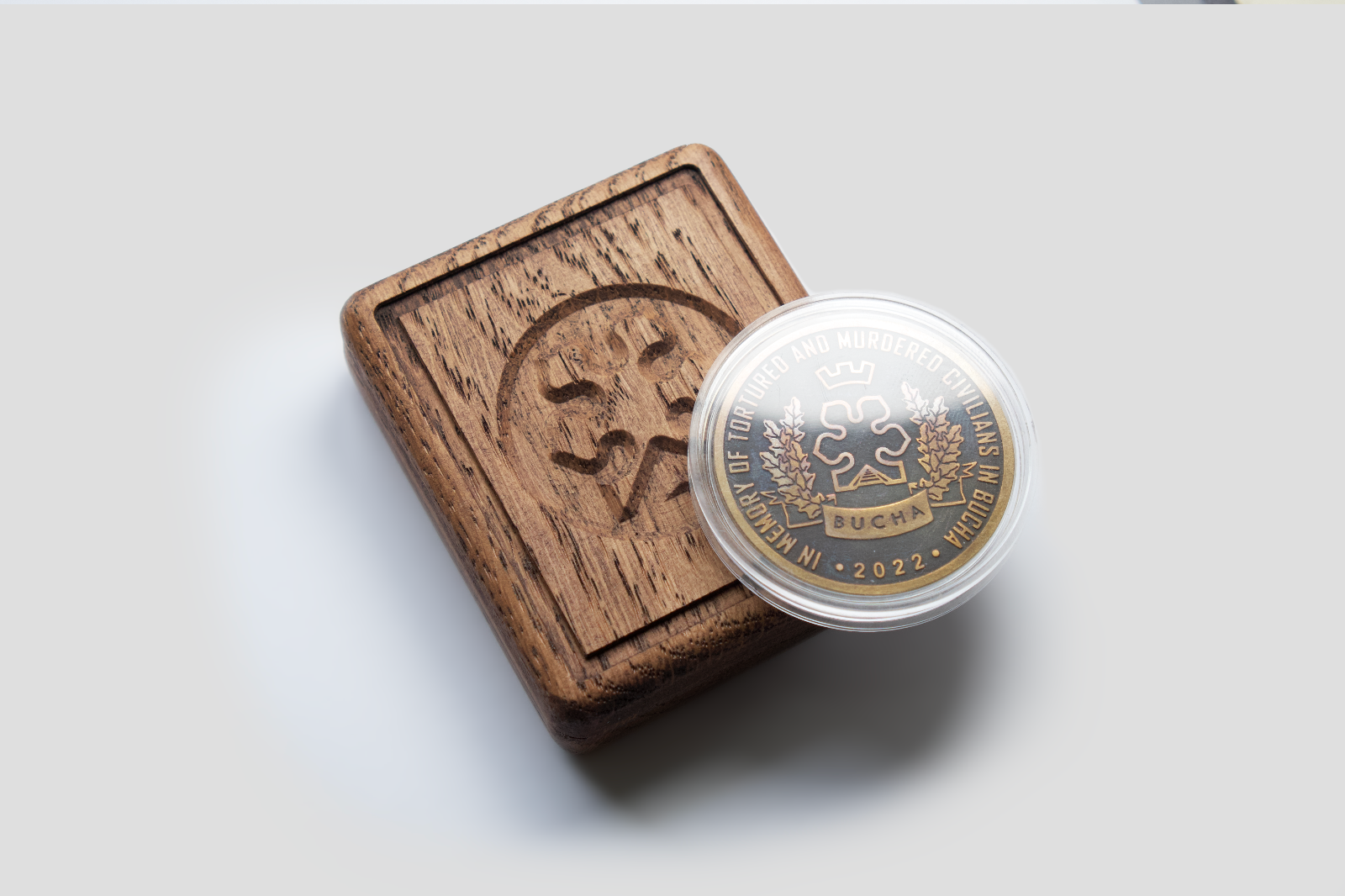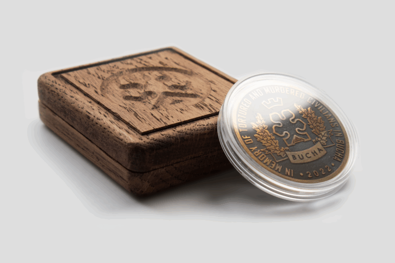 Coin “In memory of tortured and murdered civilians in Bucha” in Oak case.