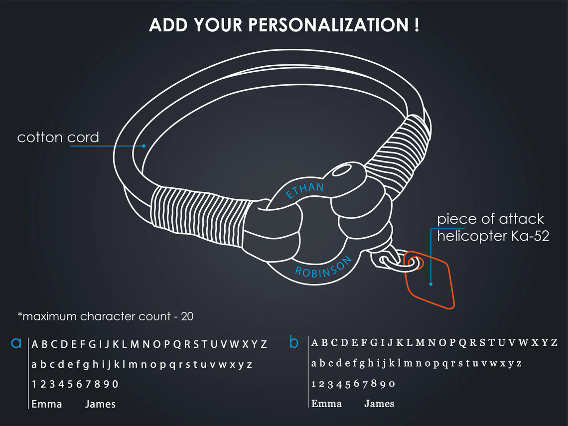 – Our battered KA-52 bracelet is a work of art known for its exceptional softness and pleasant feel against your skin. Made of 5 mm (0.2 inch) cotton rope, it adds comfort and style to your outfit.